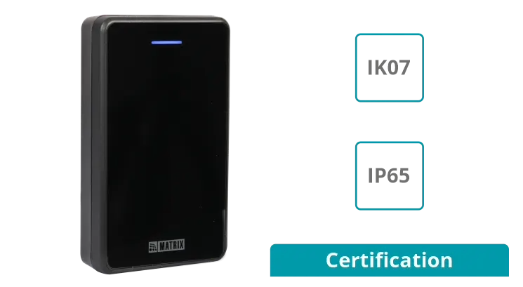 COSEC ATOM Access Control Reader boasts vandal resistance with an IK rating, ensuring its durability against rough handling and providing protection against malicious acts