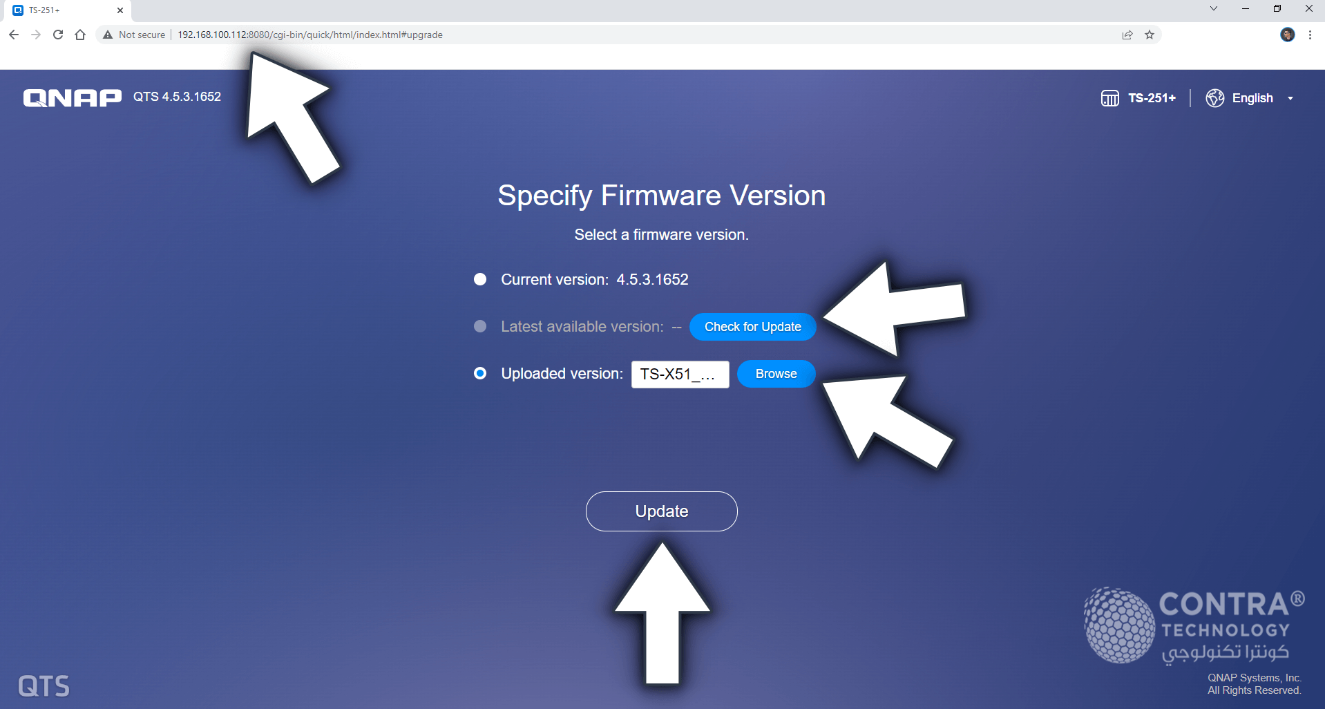 Type in your QNAP NAS address you have previously found with the help of the Qfinder Pro. Check for a real-time update or upload the latest QTS version from the official QNAP website. You need to select your NAS model, then download the QTS operating system. Click Update. Follow the instructions in the image below.